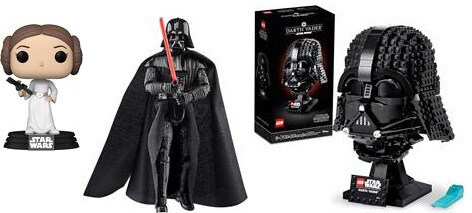 Funko Pop! da Princesa Leia, Boneco Colecionável do Darth Vader, da Hasbro e LEGO Star Wars Capacete de Darth Vader são opções para os fãs da franquia Star Wars, além do novo queridinho da franquia Grogu, que está disponível em diversos formatos no varejo.