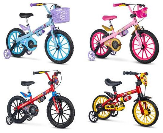Para quem sonha com uma bicicleta, são diversas opções disponíveis da marca Nathor, como a de Frozen, Disney Princesa, do Mickey e do Homem Aranha