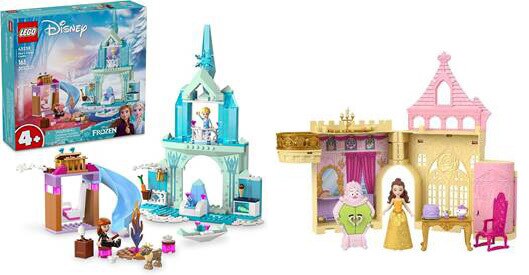 Entre as sugestões de presentes da franquia Disney Princesa está o LEGO Castelo Gelado da Elsa e Conjunto de Brinquedo Castelo Bela, da Mattel
