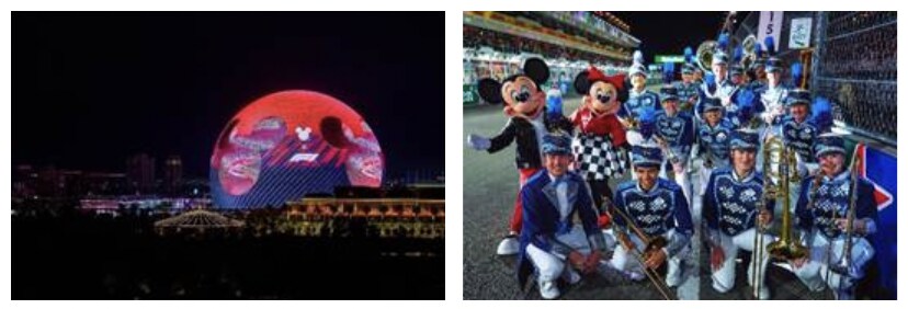 - A icônica Sphere de Las Vegas iluminou o céu com gráficos da colaboração “Acelerando a Magia” entre Disney e Fórmula 1.